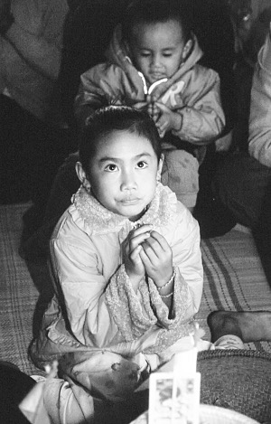 凌晨5点,我同玉波一起被她的家人叫醒,这是我一再叮嘱的,要参加赕的全过程。而玉波却揉着睡眼惺忪的眼睛哭了起来,嘴里叫着“嗨暖、嗨暖”(想睡觉、想睡觉),显然是为打扰了她的好觉而不高兴。但她今天不能不去,今天她家是专为她赕“萨拉帅”,她是主角。母亲玉金不管她哭不哭,拉着她的手就走。