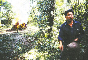 进入墓葬地,茂盛的野草,蔽日的树林,不时进入眼帘的坟堆,还有一伸一缩往人脚上爬的蚂蟥,让人毛骨悚然。来到一块刚砍过的开阔地,中央挖了一个坑,里面满是倒插着的树柴,柴堆上还放着两个旧汽车轮胎。岩化告诉我说:“一次火葬需要两拖拉机柴,如果死者家里没有柴,我们就会每家凑一两根,直到凑够为止。用车轮胎是为了更好的燃烧。”人们把棺材停放在柴堆的左侧,将“恒叫”取下,岩约将棺材盖板掀开,用从家里带来的一个竹筒里的水朝死者脸上倒。岩约告诉我:“这是给死者洗脸,帮她打扮一下。”然后,大佛爷开始念经,经文的大意是:“山上的神啊,我们的亲人到这里居住,你们要好好服侍她,把周围看管好!邪恶的鬼啊,这里是我们亲人应有的地盘,你们不得侵犯,你们不要来扰乱!”念完,就一个人先走了。然后,人们双手合掌,掌中紧握一根蜡条,围着转了三圈,妇女们也先走了。边走还边相互告诫,不要回头看,不然死人的鬼魂会跟着你走。剩下的男人将棺材抬上柴堆,将用白布裹着的死者,头朝寨子,脚朝外,意思是你已从寨子出来了,以后再也不准回寨子了。用柴压着,又把棺材砸碎,将棺材碎片也堆放上去,有人就拿来一个塑料桶,开始往上泼浇柴油,并从寨子的这方先点火。一会儿,熊熊的大火便燃烧起来。有人拿着用矿泉水瓶子装着的酒给大家倒,轮流喝。喝过一圈后,他们摘下一枝树枝,往自己的衣襟前后拍打一阵,将树枝扔进火里。岩化说:我们要走了,这样做是把身上的鬼气赶尽。我也敢紧学着他们的样子做了一通,便随人们离去。