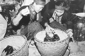 我在婚礼的头一天赶到新娘家。下午4点,村里人就劈柴的劈柴,搭灶的搭灶,杀猪宰鸭,忙得不亦乐乎。村里人告诉我,按照黎族的习惯,不管是谁家有事,全村人都要来帮忙,而且一夜都不睡觉。活干累了就开始吹拉弹唱,歇一下再接着干,直到天明。的确,这一夜完全是黎家人的劳作声和乐曲声伴我入眠的。
