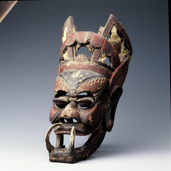 民族文化宫博物馆所藏傩面具“山王”呈凶恶之相。它头戴高大的雕花头冠,大耳,尖尖的耳翅取代了抱耳神,剑眉倒竖,双眼可自由闭合,鼻梁高耸,大嘴宽阔,下颌活动自如,长獠牙毕露,神情凶猛可怖,面部饰红黑两色。其造型、色彩、神态给人恐怖狰狞之感。