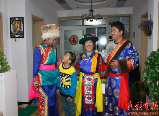 在肃南裕固族自治县各民族如同一家人。这一家有三个民族,妈妈是土族、儿子是裕固族、儿媳是藏族,一家人其乐融融。 引自民族画报