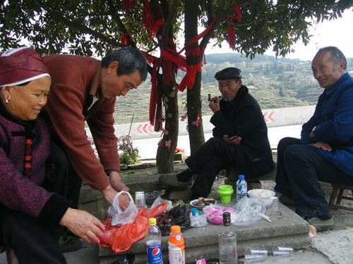 图为苗族老人在“保树”前摆放酒食开展祭祀
