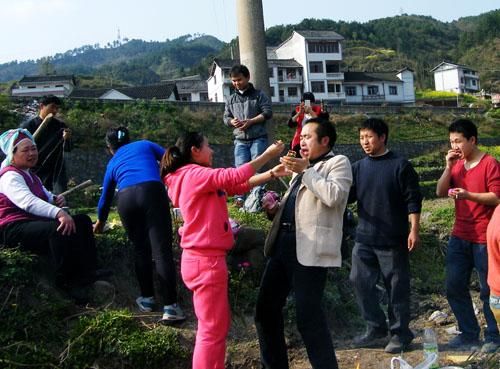 “子孙桥”落成仪式上,主人要给路人发红蛋和敬酒劝肉