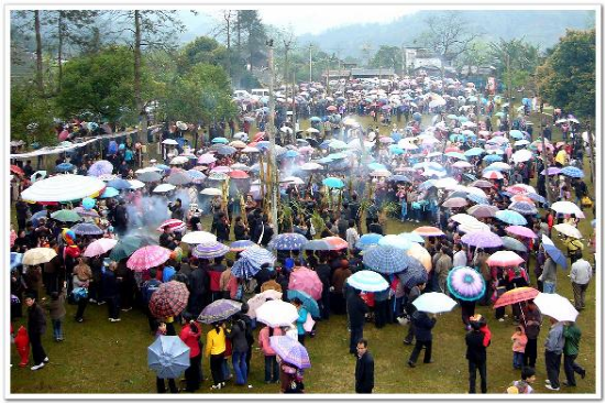 广西融水县的香粉古龙坡会于每年农历正月十六举行,所以又名“十六”坡。这一天、来自外国朋友、各地的游客及当地方圆十里的苗哥苗妹,提芦笙,提鸟笼、牵马匹,打花伞……朝着十六坡赶来。正午时分,山梁上、村道间、河溪旁,出现了成列成队穿红戴绿的人群。远远望去,似一条彩带在飘动。当万余人江集后,整个坡地就成了彩色的世界。