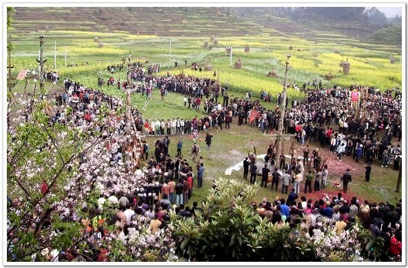 节日当天,一大清早,人们穿上节日的盛装,翻山越岭地从各条大路小路往坡会地汇集。山坡上、田垌里、公路边到处挤满了看热闹的人群。