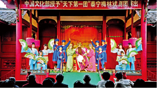 被誉为全国“天下第一团”的福建泰宁梅林戏俗称“泰宁大戏”,流行闽赣边陲,相传清乾隆年间,由徽班经江西、浙江传至闽而形成的一种乡土戏。 当时,泰宁县朱口的梅林有一寡妇周氏,家境豪富。有一年她过生日,聘请浙江的徽班来家,连演数日戏为其祝寿。后来,周氏为了能常看到戏,筹钱聘徽班艺人为家乡子弟传艺。从此,梅林乡人以学戏为一大乐事,每逢谁家子弟学戏出师登台演出,亲友便送礼恭贺。在梅林及附近乡村,人人都会唱几段“土戏”。当时流传一首民谣:“梅林十八坊,十个弟子九担箱,敲起叮铛鼓,唱起摩郎腔,茅担抬石臼,抬到坪中央,搭起戏台来,唱到大天光”。这种表演方式形成了梅林戏朴实、粗犷的艺术风格,唱念打做都有一定的程式动作,唱腔以皮簧、拨子、吹腔为主,尚有南词北调,弦索、四平调、青板,小调等;乐器分文乐(弦乐、管乐)、武乐(锣、鼓、板);音乐曲调以弦乐伴奏和吹奏乐为主。行当有“七紧、八宽、九逍遥”之称,角色也分生、旦、净、末、丑,行当全、分工细,生、旦唱词大嗓开小嗓落,每句都有“噫”的拖音,山歌风味浓。花脸唱腔节奏强烈,老生唱腔变化多,声调高昂,丑行唱念结合,全剧粗犷与婉转相兼,别有情趣。服饰精致古野考究,化装时常在眉与唇间饰以红点更觉可爱,加上语言由过去讲当地的“土官话”改为现在的普通话上演,效果更佳,因而深受观众喜爱。传统剧目有《飞龙带》、《兰腰带》、《乾坤带》、《鸳鸯带》、《双贵》、《单贵图》等。