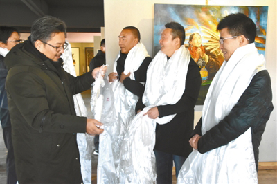 拉萨市文联、拉萨市美术家协会的会员们向索曼尼(右二)等艺术家献哈达,庆祝2018年拉萨市美术家协会索曼尼、张德才和次格等艺术家的作品画展成功举办。