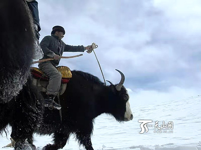 拉齐尼·巴依卡骑着牦牛行走在千里边防线上。(潘黎明 提供)