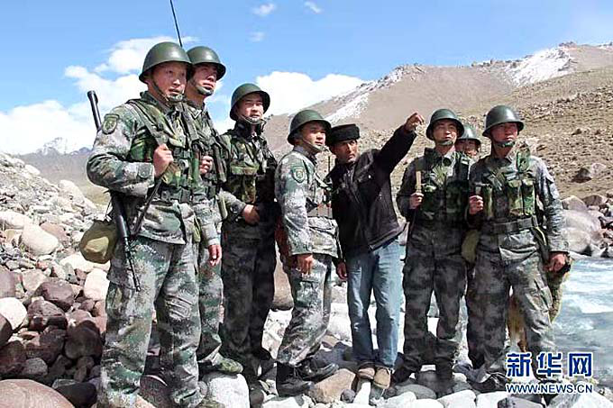 拉齐尼·巴依卡为边防官兵介绍边境的山势地形。(张庆良 摄影)