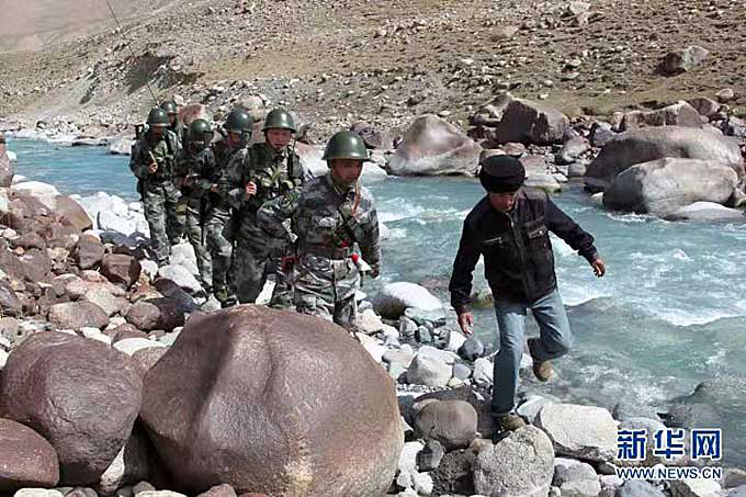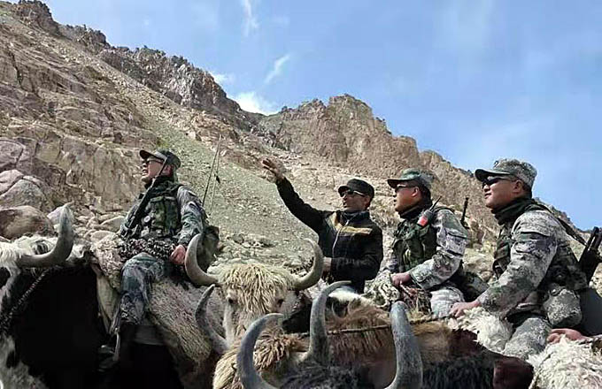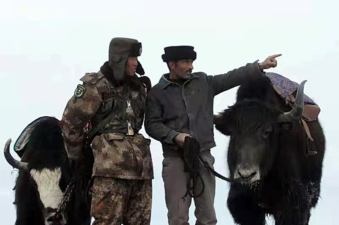 拉齐尼·巴依卡与红其拉甫巡逻官兵骑着牦牛巡逻。(新华社记者 李翔 摄影)