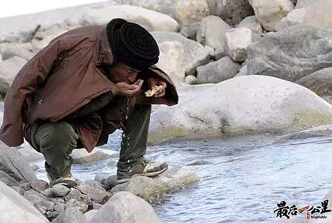 在巡逻间歇,拉齐尼·巴依卡喝着河水,吃着大馕,经常如此。(网络图片)