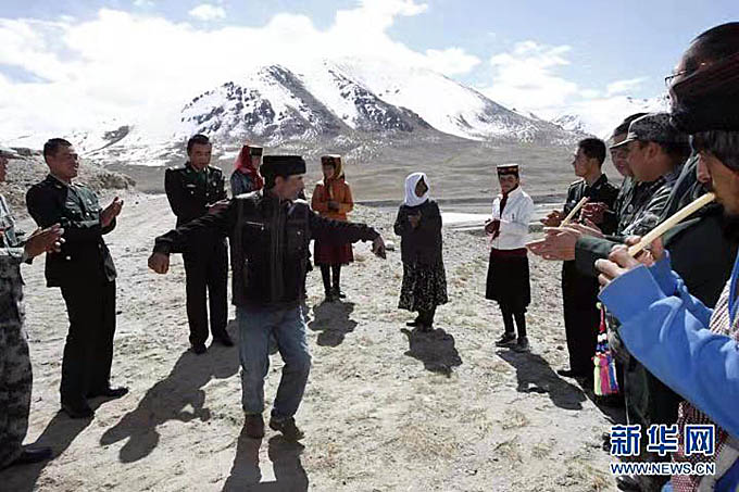 拉齐尼·巴依卡和边防战士一起与当地牧民群众联欢。(新华社记者 李翔 摄影)