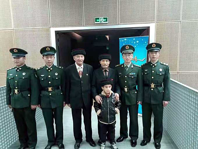 拉齐尼·巴依卡一家人在北京参加央视节目录制后与边防战士合影。(网络图片)