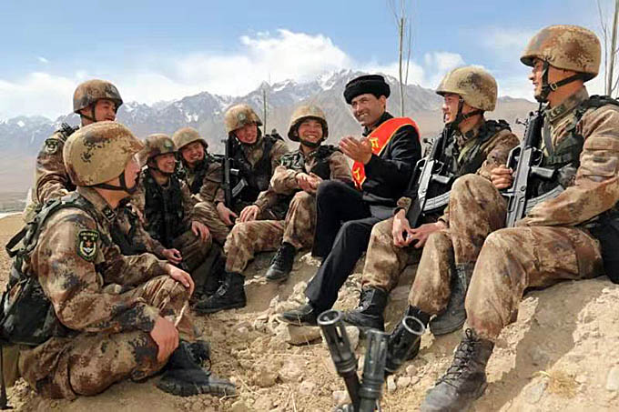 拉齐尼·巴依卡给边防战士讲戍边故事。(张庆良 摄影)