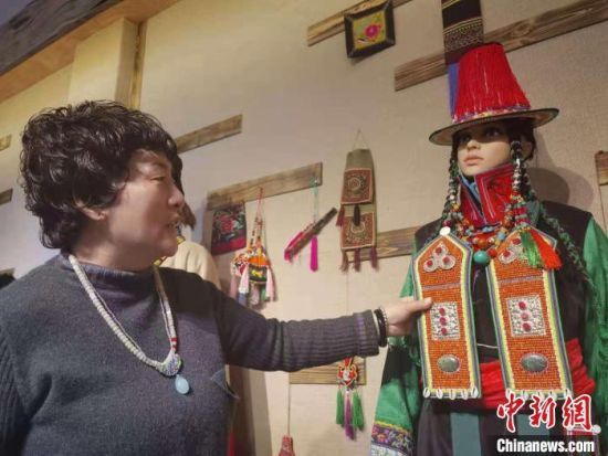 图为柯璀玲介绍收藏的裕固族服饰。 史静静 摄