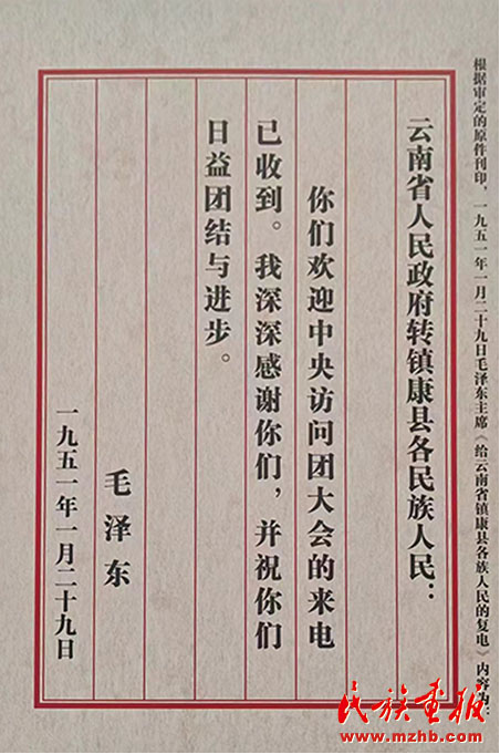 毛主席给镇康人民的回电。