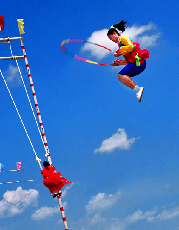 民间跳板长5.5米、宽4.0厘米左右,厚5.0至6.0厘米。跳板中间的下面立板垫,高3.0厘米。比赛时有专人守护板垫,防止跳板掉下。站在跳板两端的姑娘轮番连续起跳,逐渐将对方弹送得更高。在身体腾空时能表演出惊险动作者最受欢迎,如剪式跳、旋转跳、空翻跳,甚至跳藤圈、做造型、舞花环、挥彩带等。灵巧优美、五彩纷呈,令人眼花缭乱,惊叹赞赏。