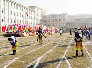 阵摆长龙跑马城。“分兵遣将选良才,阵摆长龙对面排。正欲齐心夺胜券,格格送信出城来。”这首诗描写的是满族儿童春季玩的一种游戏——“跑马城”。玩这种游戏时,孩子们分成人数相同的两队横列,面向而站。玩时,甲队先诵儿歌一句,乙队接下句,一递一句:“机机灵,跑马场,马城开,打发格格送信来!”“你要谁?我要某某某!”被点到名字的儿童立刻向对方冲去,对方阵营则手臂相连形成一道防线,冲撞者如果冲破对方的防线,就从对方阵营中挑选一人带回自己的队伍;如果没有冲破对方的防线,冲撞者就被对方俘虏了。然后双方再进行下一轮“对话”和“冲营”。游戏结束时,以剩下人数多的一方为胜方。这种游戏最适合男孩玩,他们往往玩得满头大汗,乐此不疲!