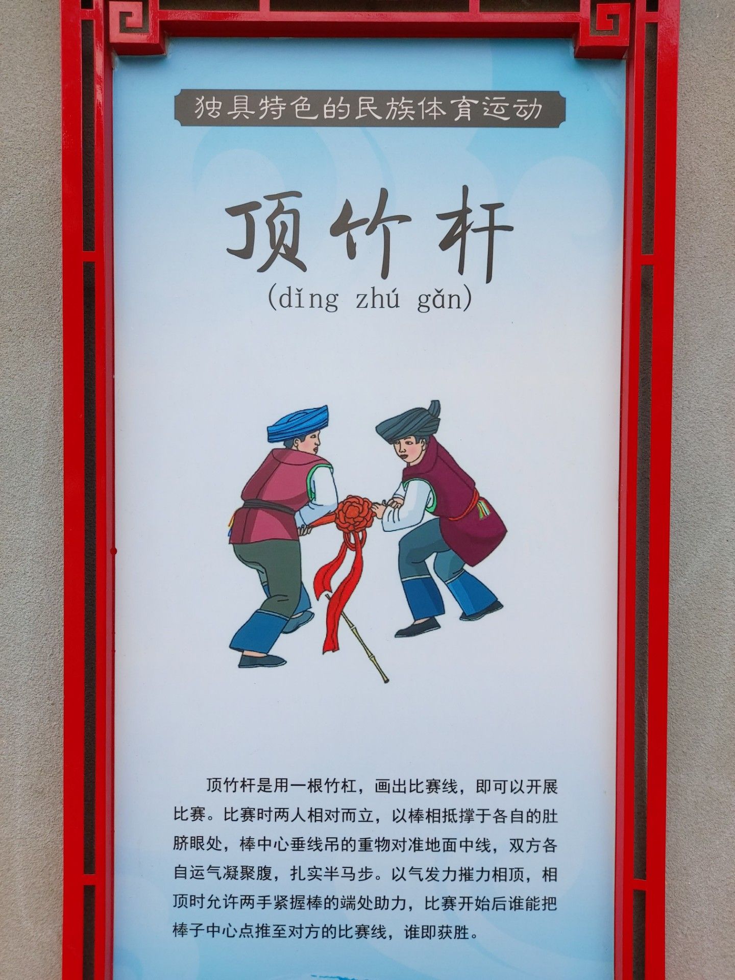 顶竹杆是用一根竹杠,画出比赛线,即可以开展比赛。比赛时两人相对而立,以棒相抵撑于各自的肚脐眼处,棒中心垂线吊的重物对准地面中线,双方各自运气凝聚腹,扎实半马步。以气发力摧力相顶,相顶时允许两手紧握棒的端处助力,比赛开始后谁能把棒子中心点推至对方的比赛线,谁即获胜。