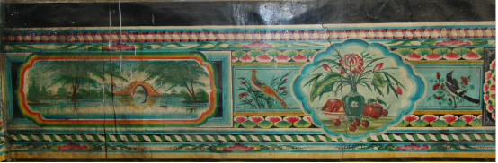 达拉特旗地区的墙围画高度一般在70厘米左右,其长度则依炕的大小而定。炕上部分的画是主体,在结构上有一套固定的模式,即以上下两组边道,按照一定的规格布置形成主体框架,中间等距离安排各种画空,既具完整对称的装饰形式美感,又具简繁对比、主从相映的丰富表现内涵。边道图案种类繁多,有折子边、卷带边、竹筒边、花边等。画空也称“池子”,有正方形、长方形、扇形、圆形等多种形式。此外,在下边道与炕距离25-30厘米的范围内是黄颜色的边子,这样的设计是避免炕上物件的遮挡和抬高人的视线,便于观赏。