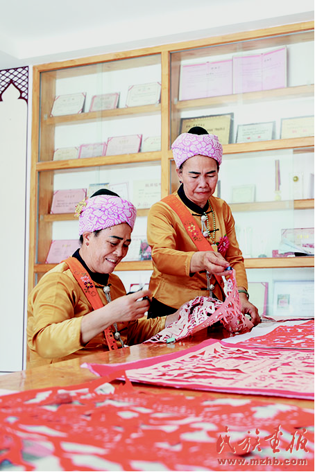 邵梅罕(右)与村民进行剪纸技艺交流。
