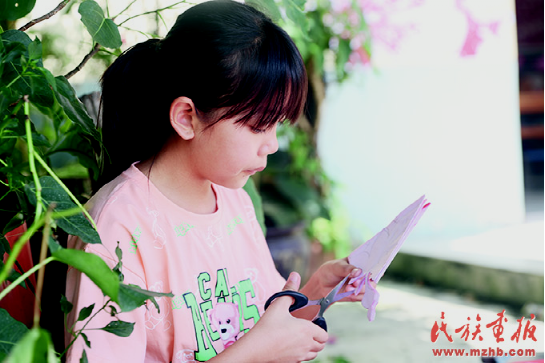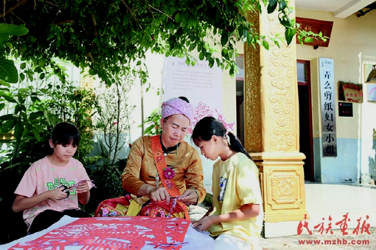 邵梅罕在剪纸艺术馆前教孙女们傣族剪纸。