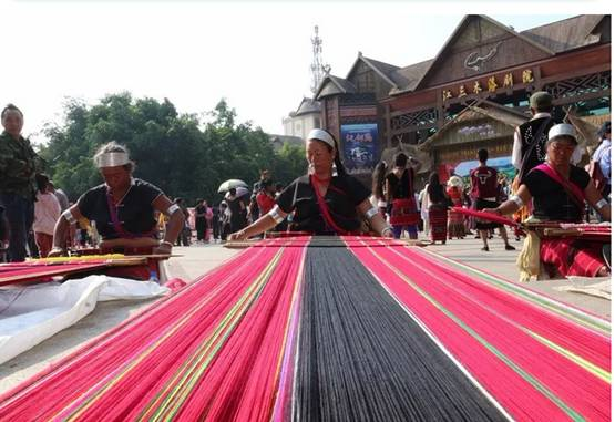 织锦是各民族生活中不可缺的劳作。纺线原料以棉纤维和麻纤维为主。 棉主要是草棉、白棉沙线、黑棉沙线、红棉沙线,麻主要为苎麻和野生火麻。在织锦的过程中,妇女端坐在纺车前,凝神专注地操持着手中的活计。 织一匹布大约需要20天至一个月左右的时间。