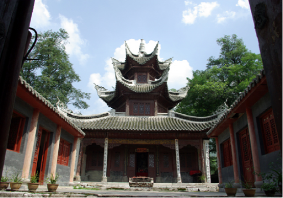 冠山,位于贵州龙里冠山盆地(县城)东隅,岩山形似金钟扑地,古木参天,葱郁苍翠。明永乐七年(1409)始建的道教活动场所掩蔽其中,可谓“山不在高有仙则名”。在历史的长河中,虽然道教一去不复返,但其紫虚观主体建筑保存尚好,现列为省级文物保护单位,由主体建筑紫虚阁、左右厢房、前殿、山门、文昌祠组成二进院式古建筑群。主体建筑为木构穿斗式三重檐六角攒尖筒瓦顶,1989年迁入的文昌祠,为木构抬梁式歇山青瓦顶,带吻正脊,戗脊翘角卷草,石质柱础浮雕仙草、竹、梅、鹿等图案。西南两面有1936年题刻的“还我河山”、“巨灵一孹”等七方摩崖石刻。建筑物的形制、布局给人一种古朴、沧桑之感。登阁骋目,远山峻岭和鳞次栉比的楼房尽收眼底,让人流连忘返。