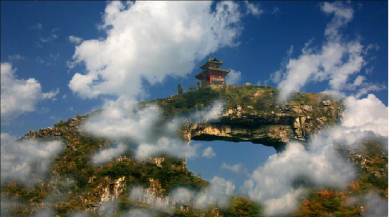 仙桥山位于贵州瓮安县城西南5公里的仙桥村,雄峙于南北伸展的长岭之巅。山顶有一长方形穿洞,远望似一面中天明镜,又若仕女发髻上的一匹玉簪。民间传说,那高悬的“桥洞”,是神通广大的仙人张三丰发怒时一拳击穿的。站在“桥”下仰望“桥”顶,如巨粱横亘天际,青崖黛壁,辉映云天。天衣无缝的“桥身”和两边的“桥墩”,浑然一体,构成跨度约40米,宽20米,高约35米的“桥拱”。“桥拱”北面的“桥墩”脚有形状各异的石洞,曲径相通。洞壁有形似人脚印石凹,传说是仙人张三丰到此云游留下的足迹。