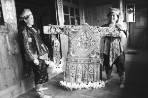 百鸟衣传承人姜老本(右)在展示自己制作的苗族百鸟衣
